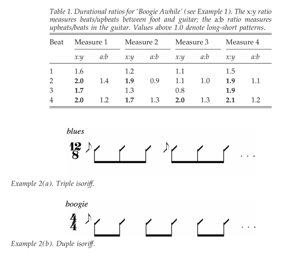 ブギにもまた、ロング–ショート型の音対に典型的な、予期されるミクロリズム的変動が見られる。たとえば『Boogie Awhile』(例1)では、拍がきれいにトリプレットへ分解されることはほとんどなく、ロング–ショート比はしばしば音対の第二音の側に歪められる。その結果、場合によっては二つの音の持続時間が明確に等しいと感じられるほどである。