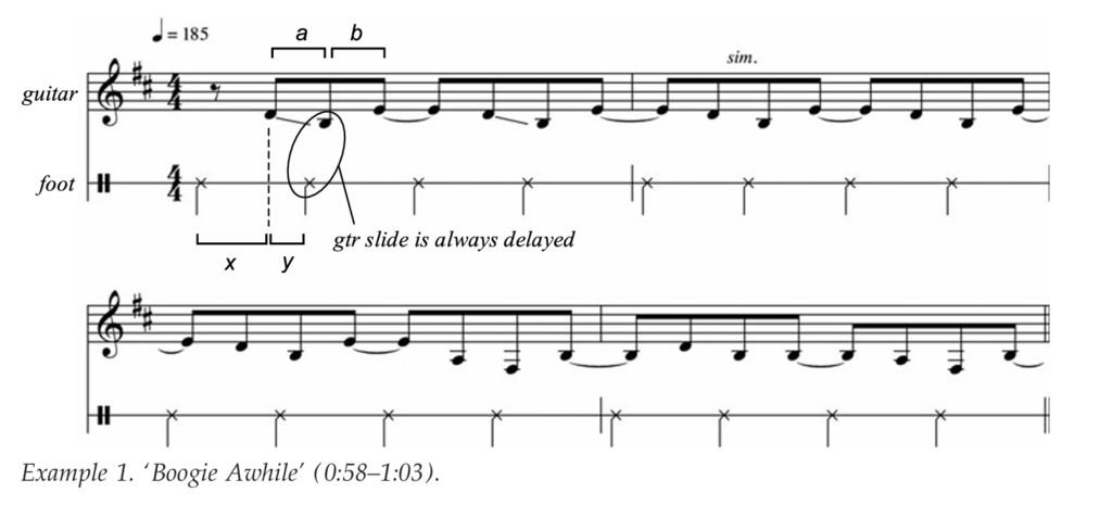 The boogie also exhibits the expected microrhythmic variance typical of long-short pairs. For instance, in ‘Boogie Awhile’ (Example 1), scarcely any beats break down cleanly into a triplet – the long-short ratio being frequently skewed in favour of the second note in the pair – so much so, that at times the durations are unambiguously even.