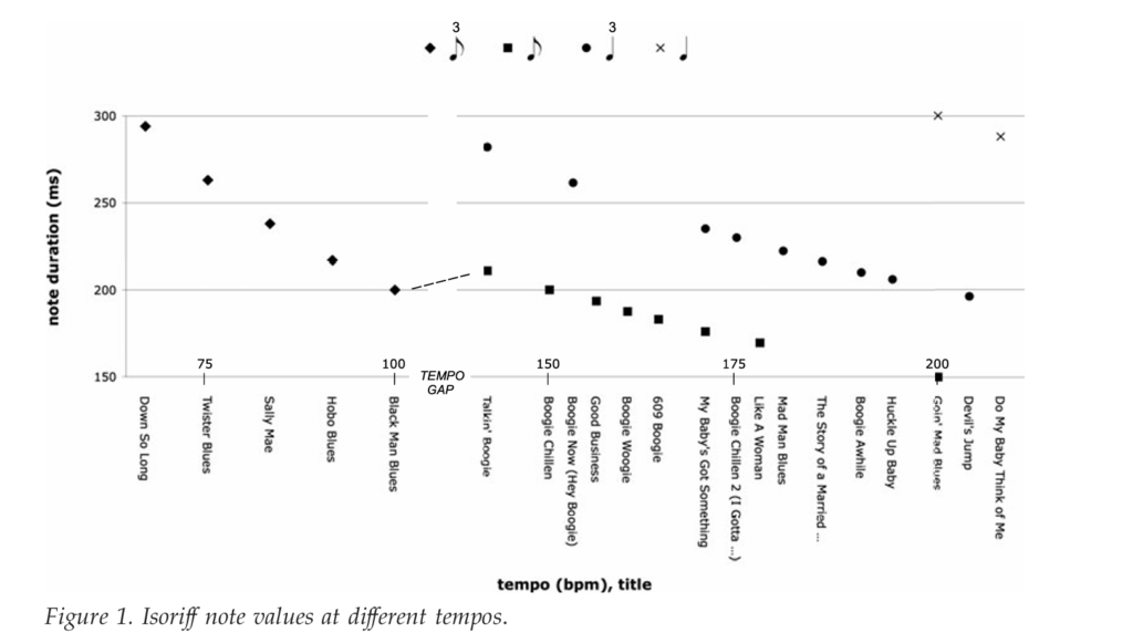 We also find exceptions to ternary subdivision in Hooker’s music. Within the blues tempo region, these are microrhythmically derived rather than metrical, as in Robert Johnson’s example above. In other words, Hooker sometimes tones down the 2-to-1 ratio of the ternary long-short pattern by evening out the durations of the two notes, a feature of jazz rhythm (Friberg and Sundström 2002; Benadon 2006) and possibly of rhythm production in general (Collier and Wright 1995).