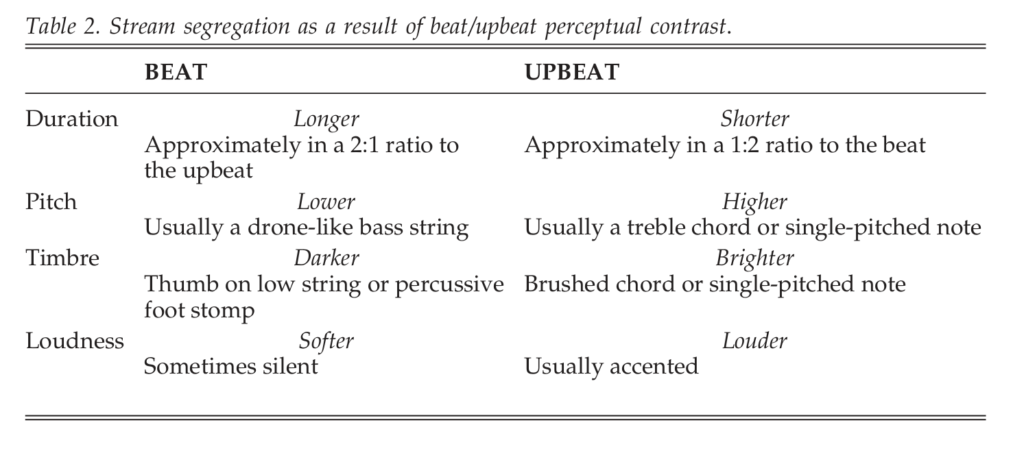 ここでは二つの関係が同時に作用している。すなわち、ビート/アップビート(x:y)と、アップビート/ビート(a:b)の音対である。足踏みはメトロノームのように機能してビートを提供し、それらがギターのアップビートによって下位分割される。