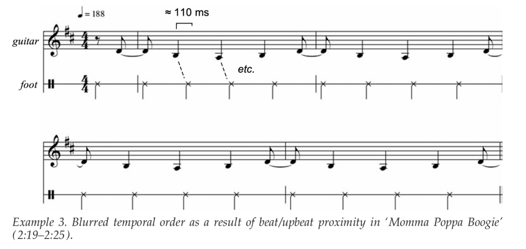 In Hooker’s case, these contrasts occur between the guitar groove’s downbeats and upbeats, whose extreme proximity also blurs their temporal order. These expressive effects are complemented by global and gradual accelerandos that envelop Hooker’s early performances.